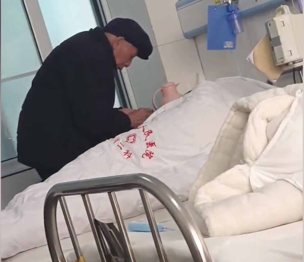 湖南的一家医院里,老爷爷细心地给生病的老伴一点点把手擦拭干净。
