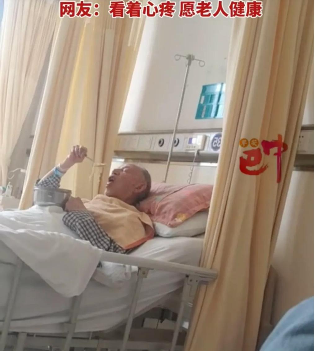 一位年迈的老人虚弱地躺在病床上,胸前垫着一张毛巾,一只手颤颤巍巍地往嘴里送面条。