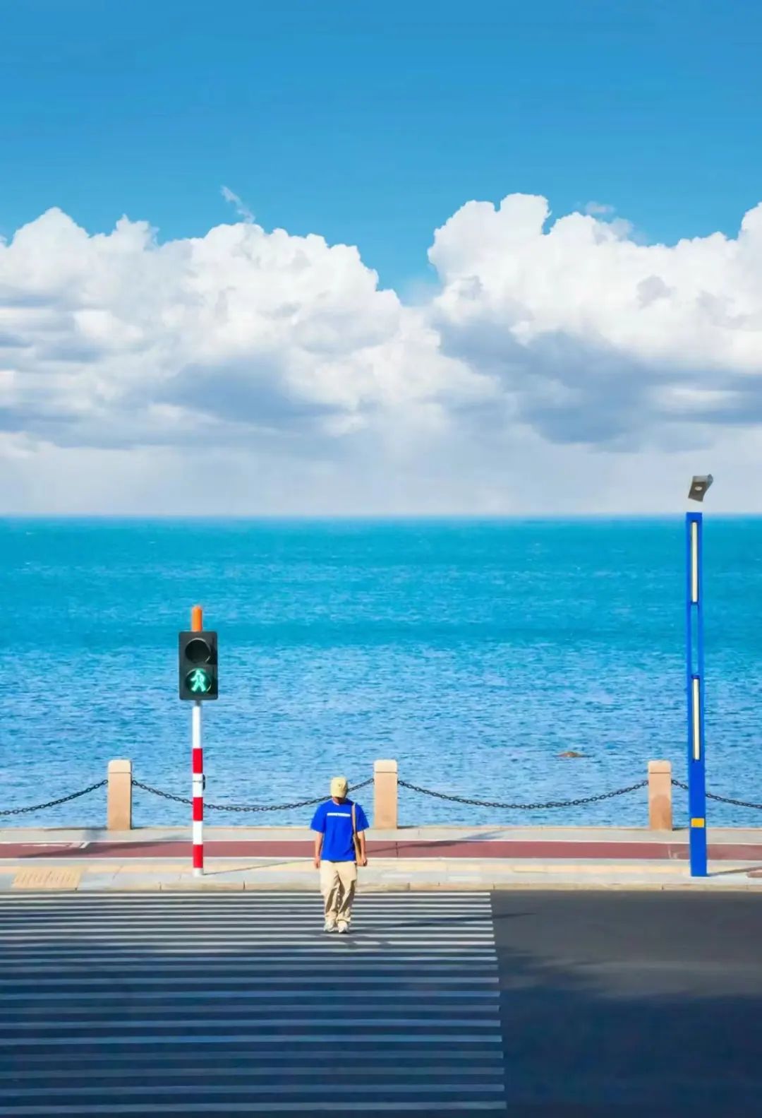 ©️申一焱下午五点左右的阳光会把新城北路的整个海面映成蓝色,像直接闯入了动漫里的场景。