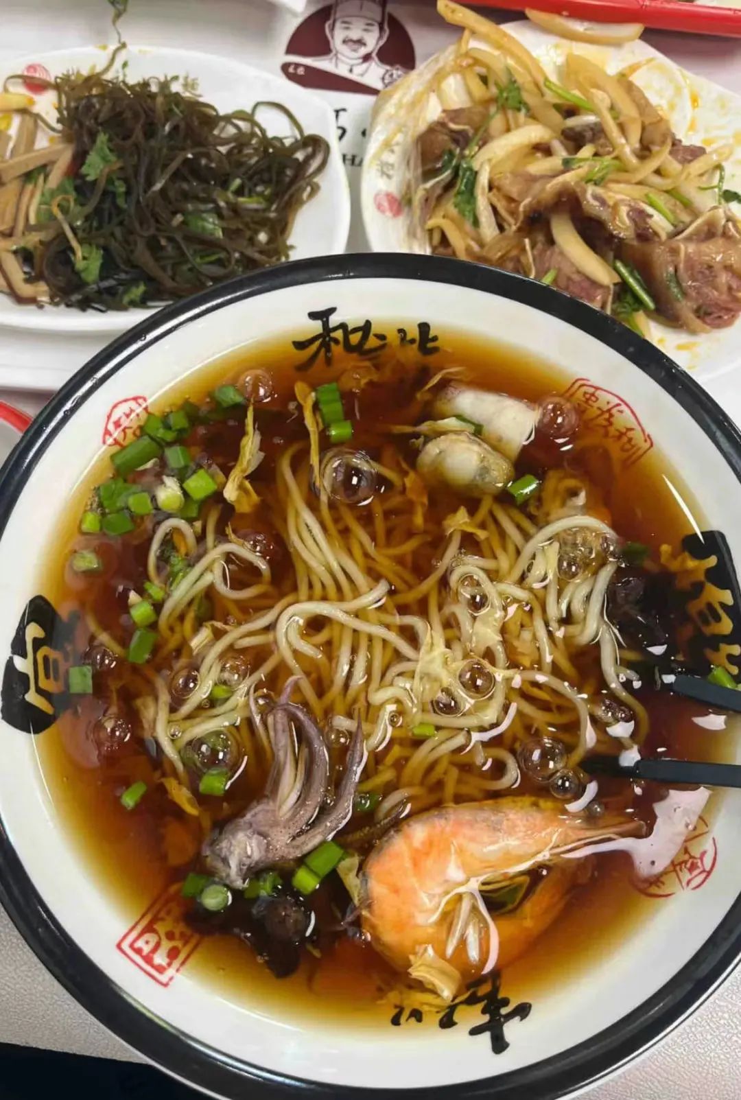 而蓬莱小面更看重卤子,尤其是鱼卤,简直就是经典中的经典,在此基础上还可以加鲍鱼、海虾、海参等。基础版的几块钱就能吃一碗了。
