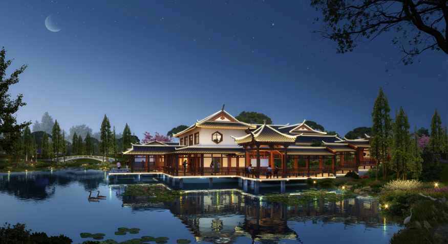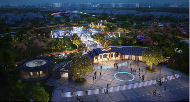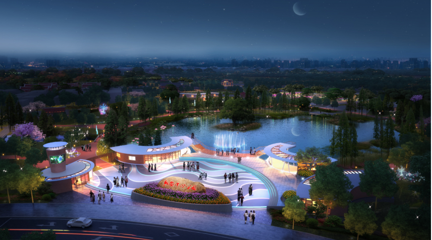 北入口主题为“花好月圆”,以月牙和花瓣的形态作为平面构图要素,中间为亲水台阶,两侧为观景台,与夜景灯光相结合,是夜景集会,游赏观月的佳地。