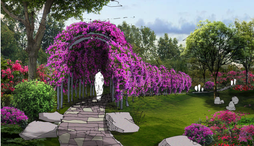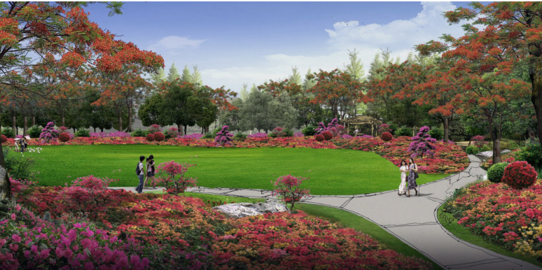 在公园最高点设计观景平台,结合大草坪及花海,为市民提供登高望远、看花赏景的开阔场地。
