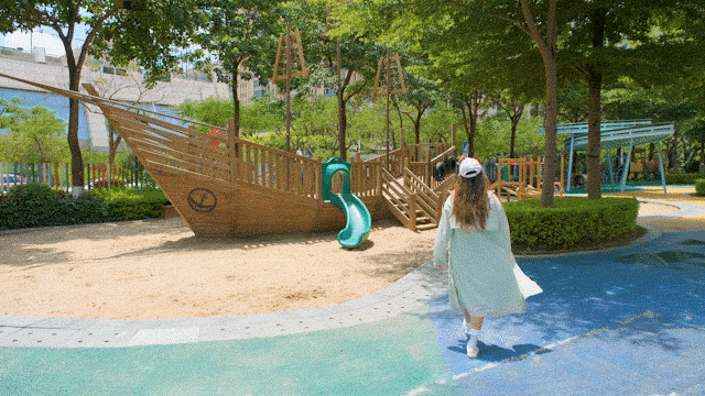 公园内设置的木质波浪形休息处让人眼前一亮,不仅可以坐在上面,也有下方的空间。在炎炎的夏日,就可以躲到波折下方避暑,而冬天就可以在上面晒太阳。而且造型别致,成为公园内靓丽的风景之一。