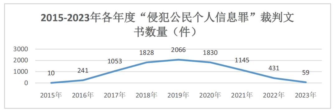 在中国裁判文书网上,以侵犯公民个人信息罪、刑事一审、基层法院、判决书为关键词进行搜索,可以获得2015-2021年侵犯公民个人信息犯罪判决数量分别是:2015年10件,2016年241件,2017年1053件,2018年1828件,2019年2066件,2020年1830件,2021年1145件,2022年431件,2023年59件。
