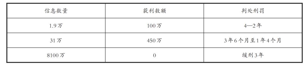 从判处刑罚与侵犯公民个人信息数量的关系上来看,以最高检2022年12月7日发布的5件依法惩治侵犯公民个人信息犯罪典型案例为例,犯罪人通过网络获取公民个人信息1.9万条,获利100万,判处4年至2年;获取公民个人信息31万条,获利450万,判处3年6个月至1年4个月;获取公民个人信息8100万条,获利0元,判处缓刑3年。由此可见,与获取公民敏感个人信息50条,普通个人信息500条的入罪数量相比,情节特别严重侵犯公民个人信息数量为基础刑的10倍以上法定刑升格的数量标准相比,司法实践中侵犯公民个人信息数量与法定的量刑标准相差极其悬殊,无论是从获利数额还是侵犯公民个人信息数量均为巨大的情况下,依然判处较为轻缓刑的刑罚。