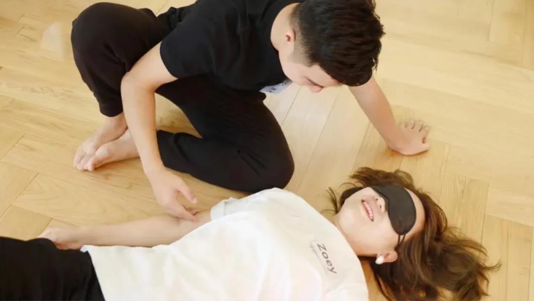 前戏沉浸式艺术坊活动现场为了打开大家身体的雷达,罗南希在课堂上将学员们性别打乱,分成AB两组,进行“五感练习”。一组同学平躺在地上,另一组用按摩油帮其按摩手脚,或是用羽毛轻轻划过对方的脸等。