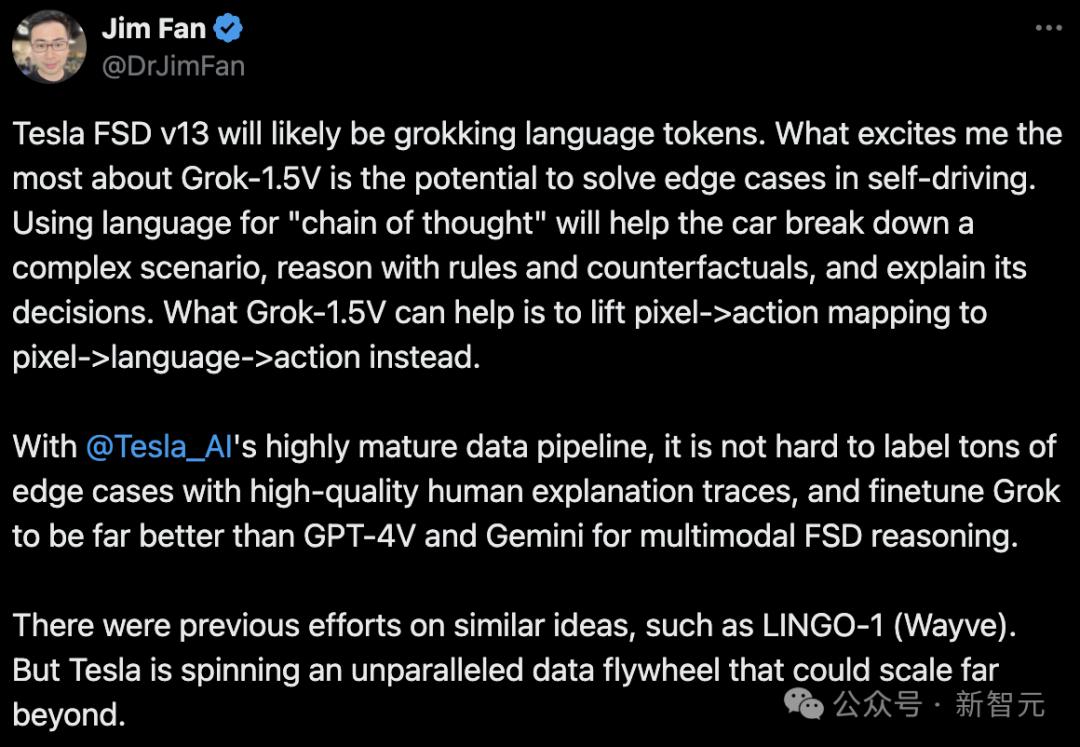 英伟达高级科学家Jim Fan发现了Grok-1.5V的「最大亮点」:在他看来,Grok-1.5V最令人感兴趣的,就是解决自动驾驶边缘案例的潜力。