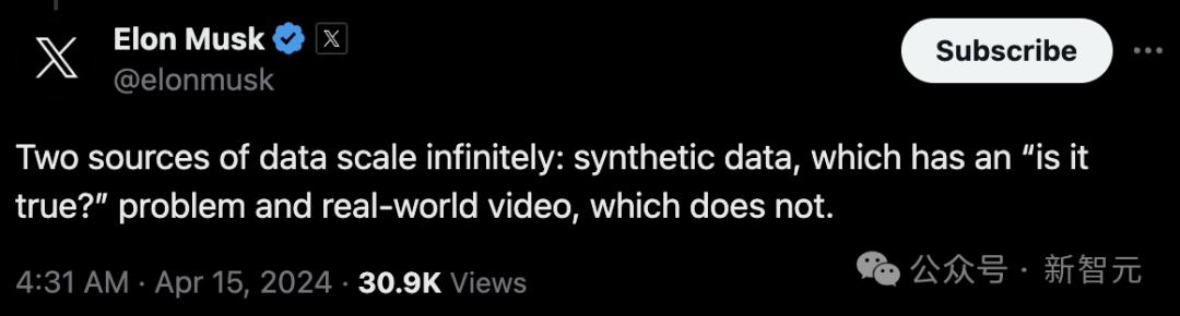 马斯克也适时地出现在了留言区,进一步解释道——有两种数据源可以无限扩展,合成数据和真实世界视频。前者存在一个真伪的问题,而后者则不存在。