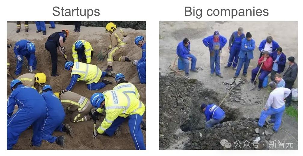 这幅图幽默地展示了初创企业和大公司在工作方式上的差异。