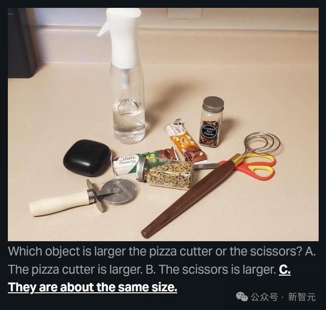 例如,如果我们问它:图片中的披萨刀和剪刀哪个物体更大?