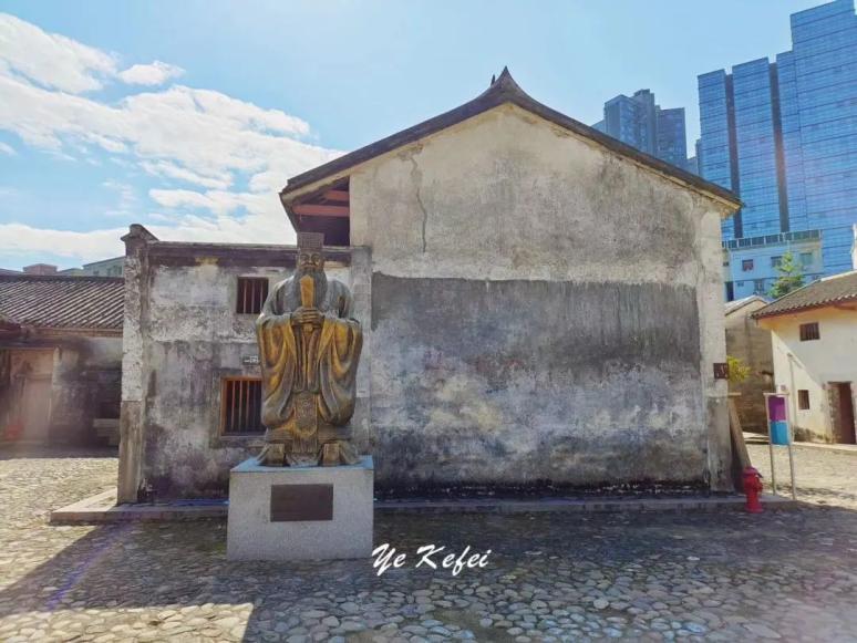 大万世居广场上的曾子像▲明新学校并不在大万世居内,而是立于一旁,周遭都是新建的民宅。相比纯粹客家风格的大万世居,明新学校显然有着时代的痕迹,兼具中西建筑风格。灰黄色墙身虽然经过修缮,但仍看得出斑驳痕迹,楼前古树枝叶繁茂。