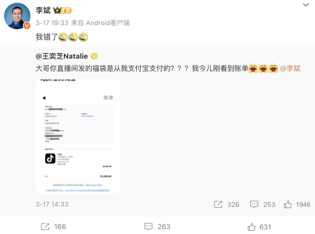 李斌是为数不多的开始尝试抖音的汽车企业一把手。今年3月,他第一次在抖音上直播,共有383.8万观众看直播,他的账号因此涨粉14.3万,获得3.3万元直播收入。这场直播还制造了微博上另一大热点——他在直播中送了很多福袋,却是用他的老婆王奕芝的支付宝来支付的,两人因此在微博上“家长里短式”的对话带动了用户积极进行讨论。