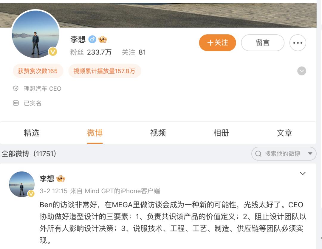 (李想的微博已经超过1个月没有更新,从“金V”降级成“黄V”)“从这一点来说,我很佩服李想,他能拿捏这种情绪。每一个人透过屏幕的这些文字,能看到的是一个活生生的有情绪的人,而不是只会编辑文字的机器。”他还举了两个例子,其中一个是魏建军在微博上说他们组织了对小米SU7的评审,要向小米学习;第二个则是类似于李斌和他的夫人在微博上的对话,用一些工作、对话的细节向用户展示不一样的形象。