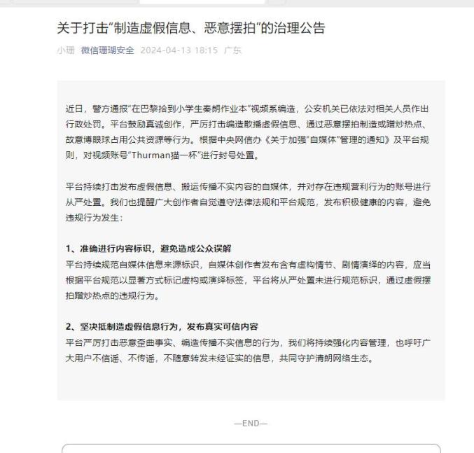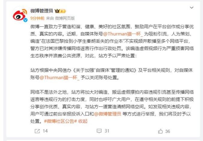 微博:对自媒体账号@Thurman猫一杯_ 予以关闭账号处置微博一直致力于营造和谐、健康、美好的社区氛围,鼓励用户在平台创作或分享优质、真实的内容。近期,自媒体账号@Thurman猫一杯_ 为吸粉引流,人为策划、编造“在法国巴黎拾到小学生秦朗丢失的作业本”不实视频并散播至多个网络平台,警方已对其涉嫌传播网络谣言行作出行政处罚。该编造虚假视频行为严重损害网络生态秩序并浪费公共资源,对此,站方予以严肃处置:
