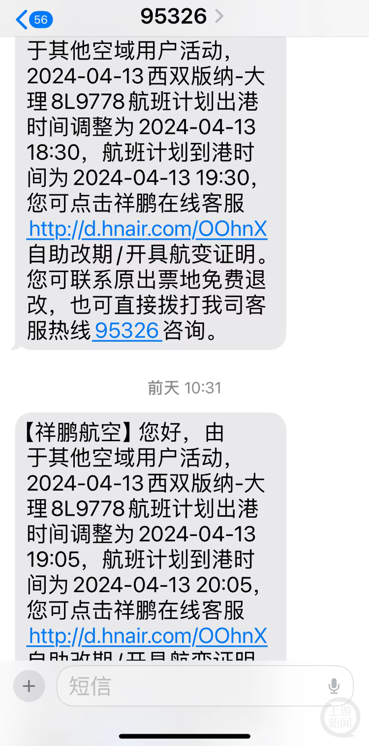 湖北游客小冯(化名)最近和妈妈在云南旅游,13日晚原本将搭乘祥鹏航空的8L9778航班从西双版纳飞往大理,按照行程航班将于17点55分起飞。当天上午,小冯收到祥鹏航空的通知短信,起飞时间调整为19时05分,随后又短信通知调整为19时30分。