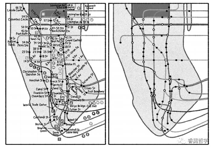 卡尔纳普借助铁路系统进行了结构描述。我用纽约地铁来举例子。下图包含了曼哈顿下半部分的地铁系统的两张图片。第一张图片有线路和车站的标志。它告诉你第8街/纽约大学站在R线和W线上,以及诸如此类的信息。第二幅图去掉了线路和车站的标志。它告诉你,在这个地区有80个车站排列在20条左右的线路上(这取决于你的计算方式),它们构成特定的复杂模式。