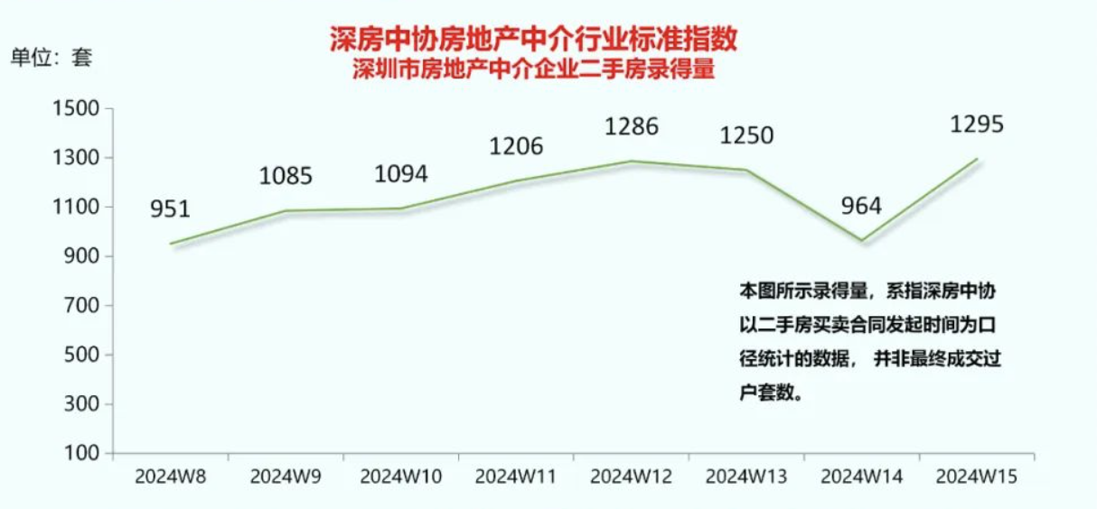 4月15日,深圳市房地产中介协会发布数据,2024年第15周(4月8日至4月14日),深圳全市二手房成交量(含自助)录得1295套,环比增长34.3%,单周交易量再创2022年以来新高。