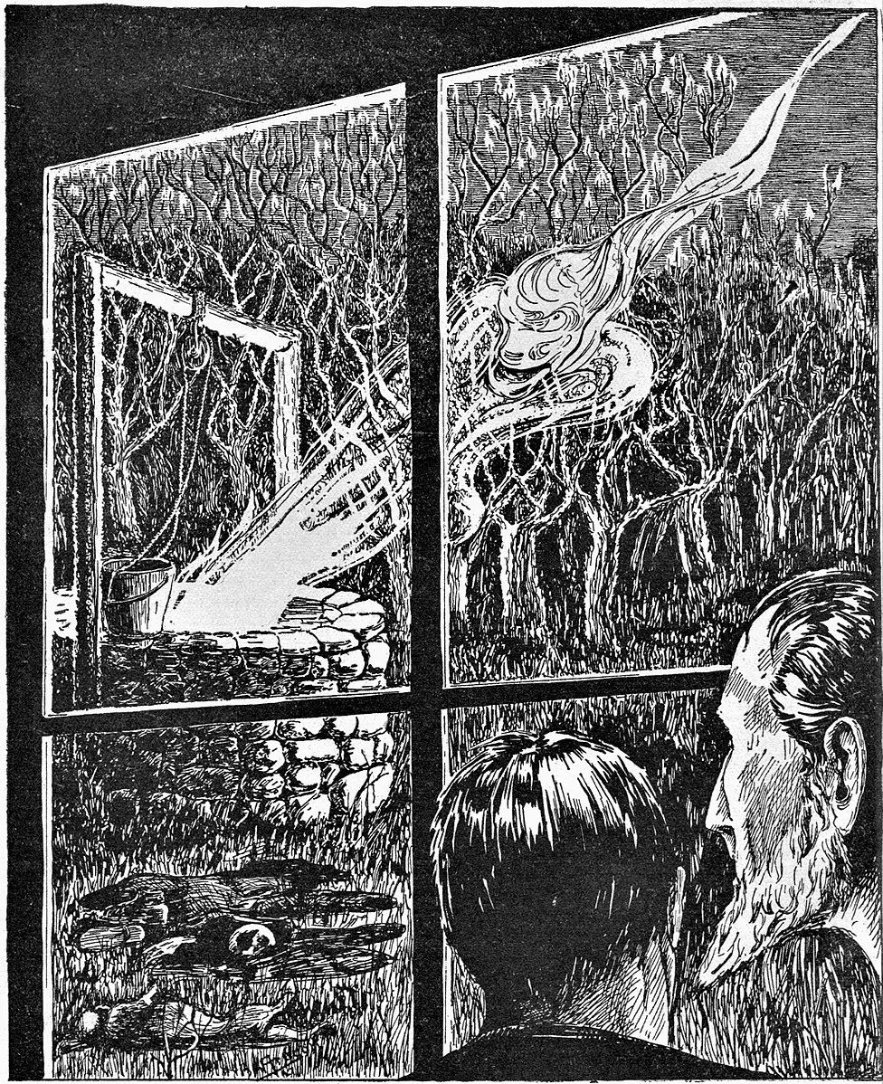 J·M·德·阿拉贡(J.M.de Aragon)为《空间之外的色彩》所绘插图。© wikimedia《空间之外的色彩》(The Colour Out of Space,1927)是这一发展的典范。该小说中的加德纳家族,他们看到了一个诡异、发光的岩石状实体,即“色彩”,从天空坠入他们家附近的一片田地中。这个“色彩”开始在加德纳家族中蔓延,感染了农作物(使其变成了灰色且脆弱)、家畜(变得疯癫)、水源以及家族自身。加德纳的大儿子疯了,他的另一个儿子在井里取水时失踪。加德纳和他妻子身体出现畸形,并失去了所有的知觉。