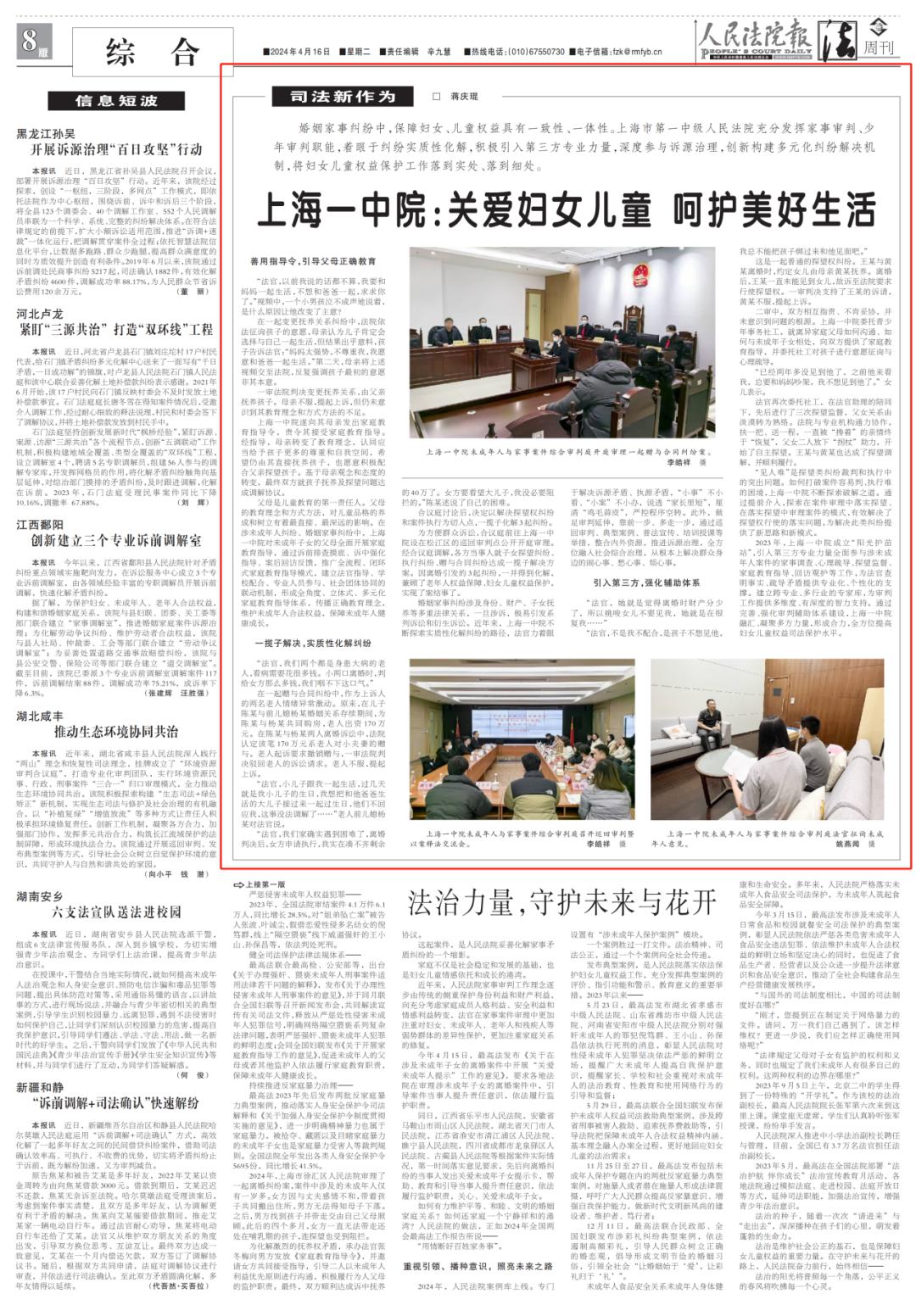 织密妇女儿童权益法治“保护网”,上海市第一中级人民法院一直在努力。他们有哪些司法新作为?今天(4月16日),在上海一中院院内,正举行一场以保护妇女儿童权益为主题的开放日活动,《人民法院报》今天也以《上海一中院:关爱妇女儿童 呵护美好生活》为题专题报道上海一中院司法保护妇女儿童权益工作举措及成效,请跟随小编一起来看看。