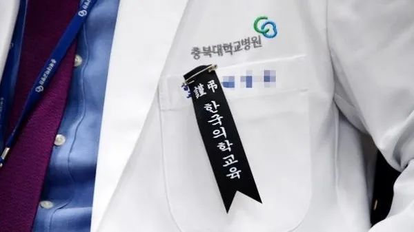 3月7日,韩国忠北大学医学院教授紧急对策委员会记者会,参会的一位紧急对策委员会委员胸前佩戴着写有“韩国医学教育”字样的谨吊丝带。
