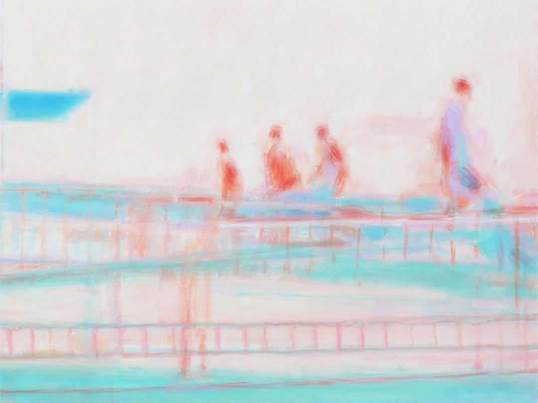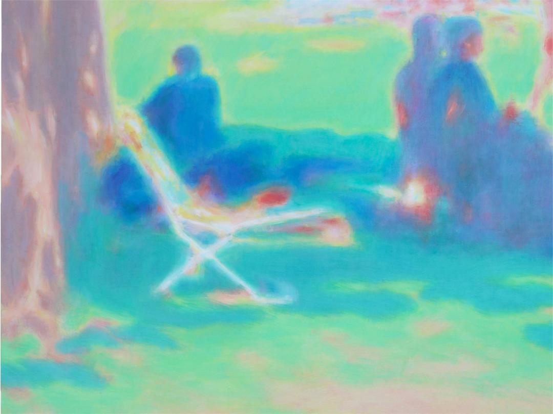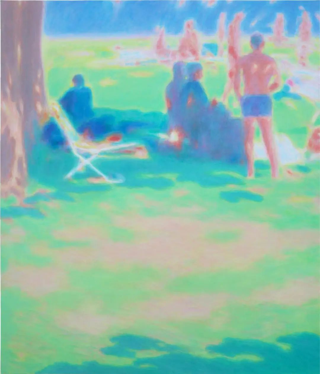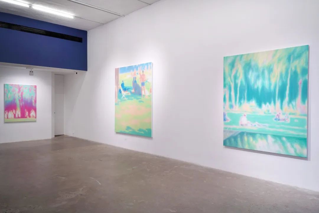即便喜欢朱利安·奥培、图伊曼斯、亚历克斯·卡茨等艺术家作品,刘艺超却没有走上前辈的路。他选择虚化轮廓,有意去除边缘线,用层层叠叠的色彩组合,蔓延开来的轮廓,最终构成具象的画面。调整色彩关系和轮廓,忽略细节并剪裁构图成为画面,而非传统意义的描摹和对景拷贝。