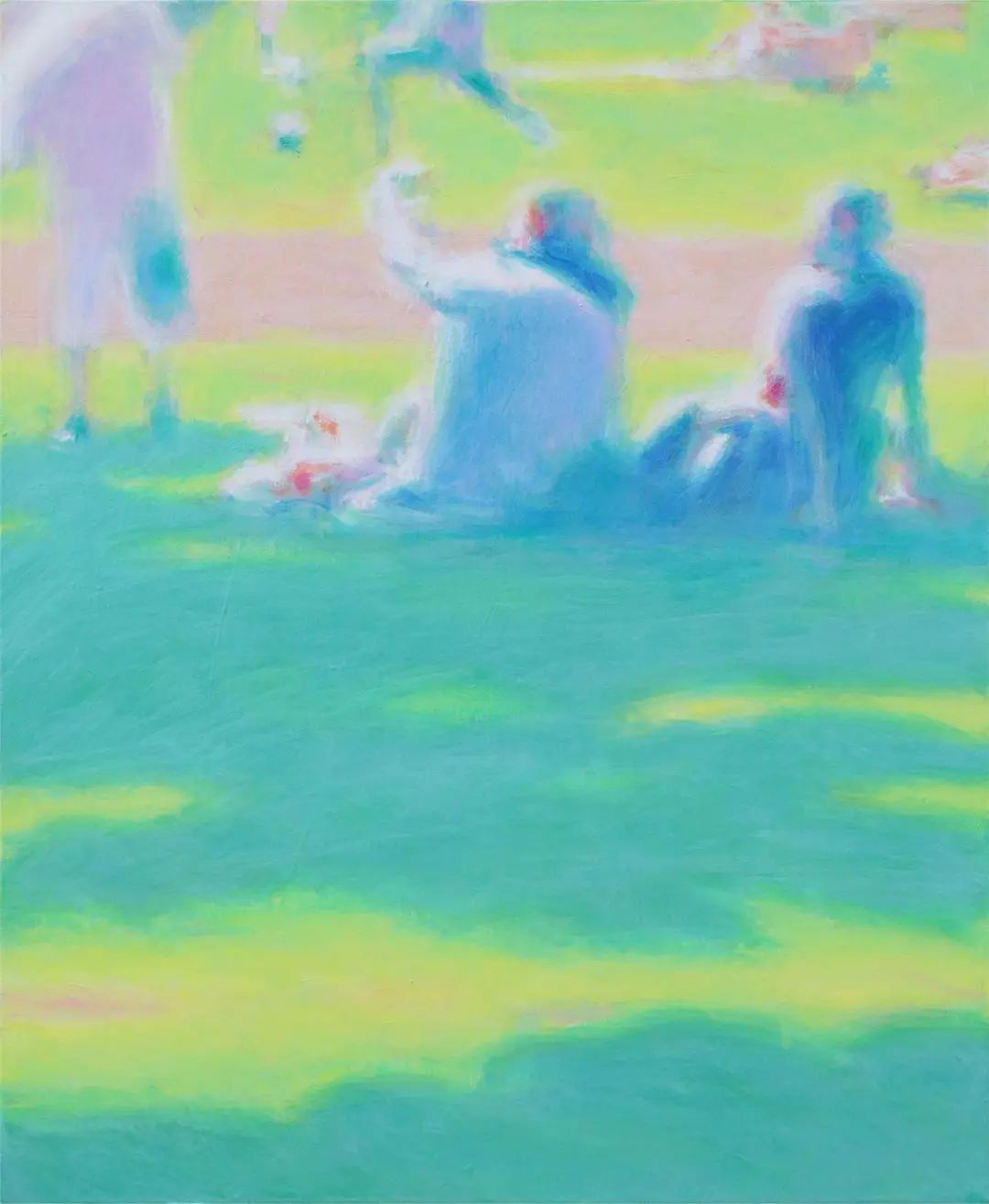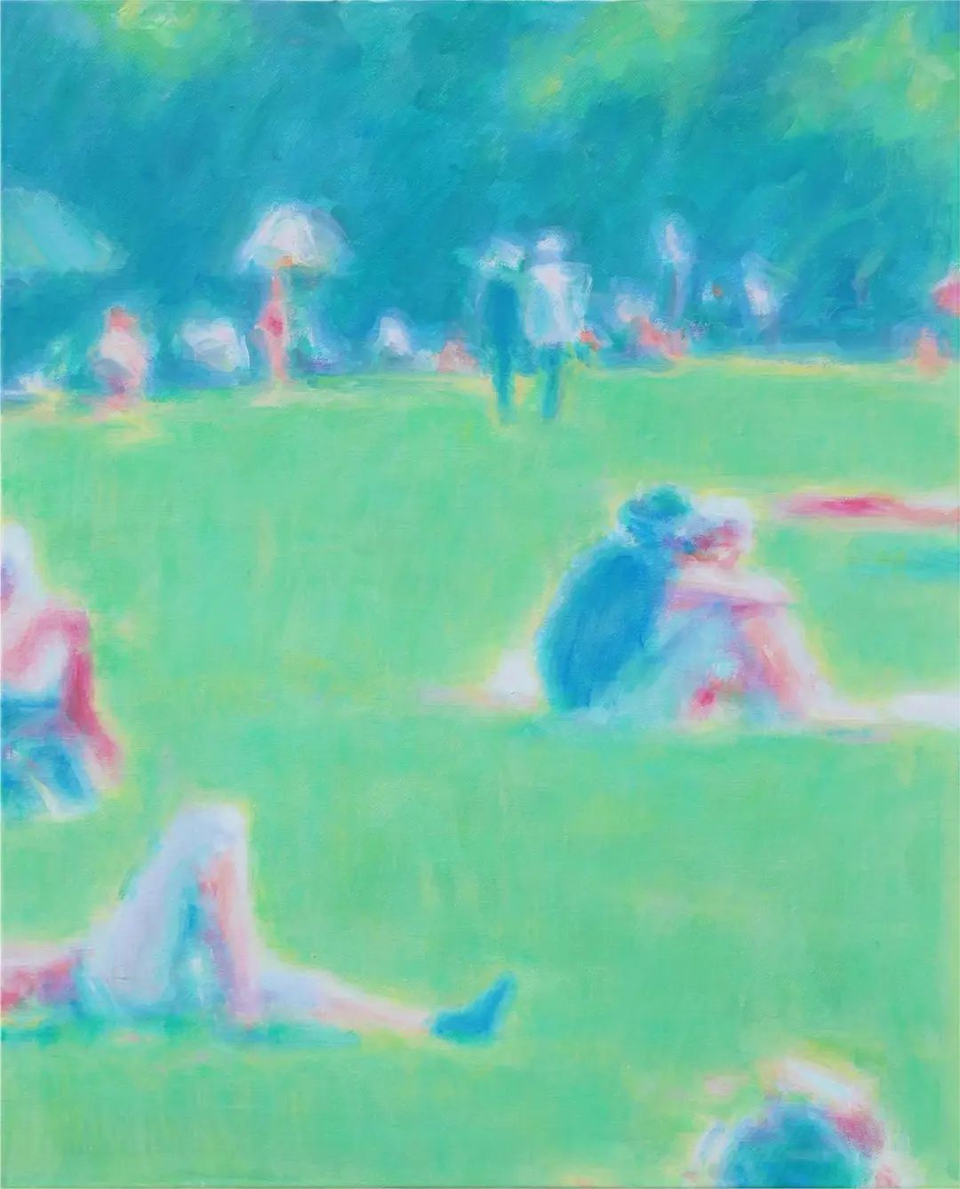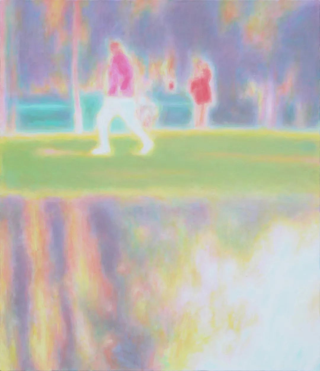 即便喜欢朱利安·奥培、图伊曼斯、亚历克斯·卡茨等艺术家作品,刘艺超却没有走上前辈的路。他选择虚化轮廓,有意去除边缘线,用层层叠叠的色彩组合,蔓延开来的轮廓,最终构成具象的画面。调整色彩关系和轮廓,忽略细节并剪裁构图成为画面,而非传统意义的描摹和对景拷贝。