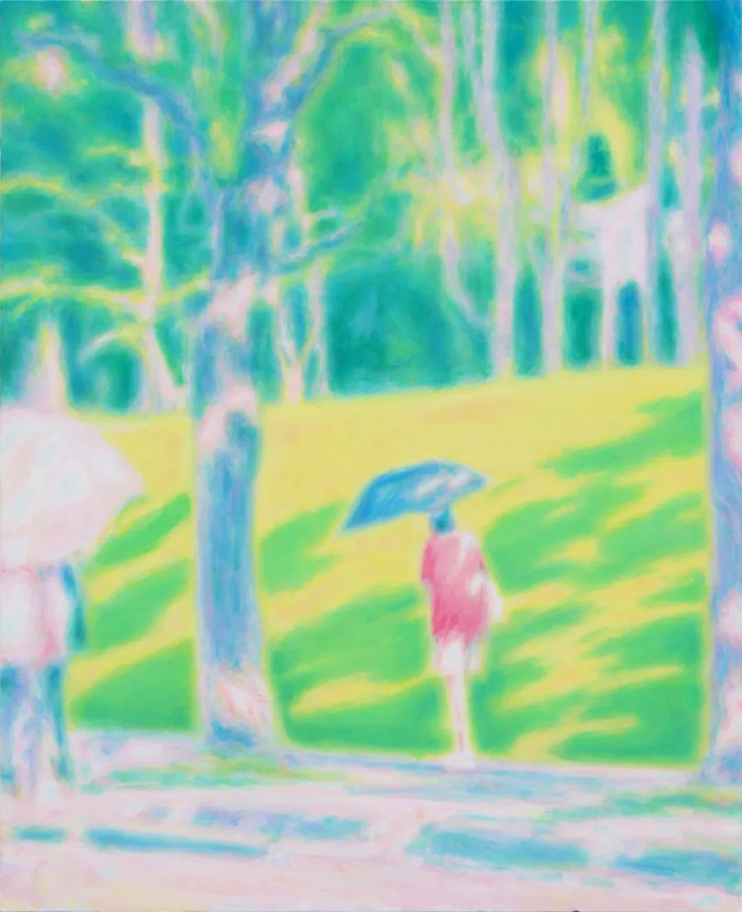 刘艺超痴迷于这种魔力,最终让这种魔力成为最具辨识度的语言。夏日蓝绿色的树影、秋天金灿灿的光,即便是描绘黄昏,色彩中依然残留着炽热。这样超现实的色彩系统之所以让人感到真实,出于艺术家对日常风景的高度提炼,以及巧妙的艺术语言转化。