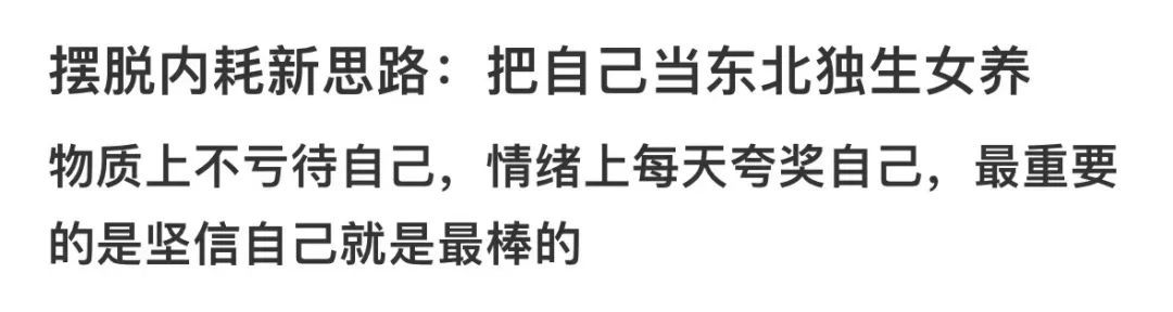 当代年轻人一旦在生活里碰到点儿事,所能想到的解法,要么是向外寻找,奔赴各大寺庙里求神拜佛;要么从自身挖掘,试图把所有事都追溯到原生家庭。在生活里处处碰壁,又无法寻求原生家庭的治愈,有些人发现,最舒服的自洽思路,是把自己当“东北独生女”那样,重新养自己一遍。