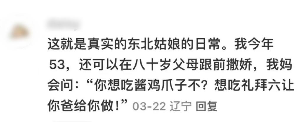 “东北父母从不把子女当作实现自己遗憾的工具人,在他们眼里,孩子只要平安健康就好。对儿子更严厉,是怕他们学坏了,而对女儿宠爱有加,是怕亏太多会让她被坏小子拐走。”