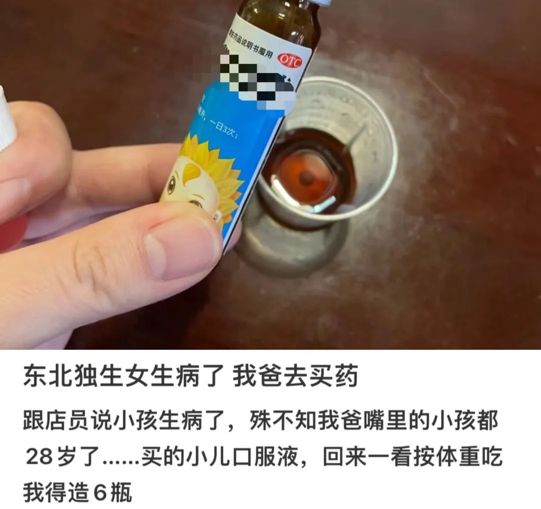 即使东北独生女嫁了人,在家里也可以一直被当做小孩养。互联网上一直流传的梗,是当东北爸爸去药店告诉店员“小孩生病了,不要太苦的药”,买回来的药“按自己的体重,一次得造六瓶”。