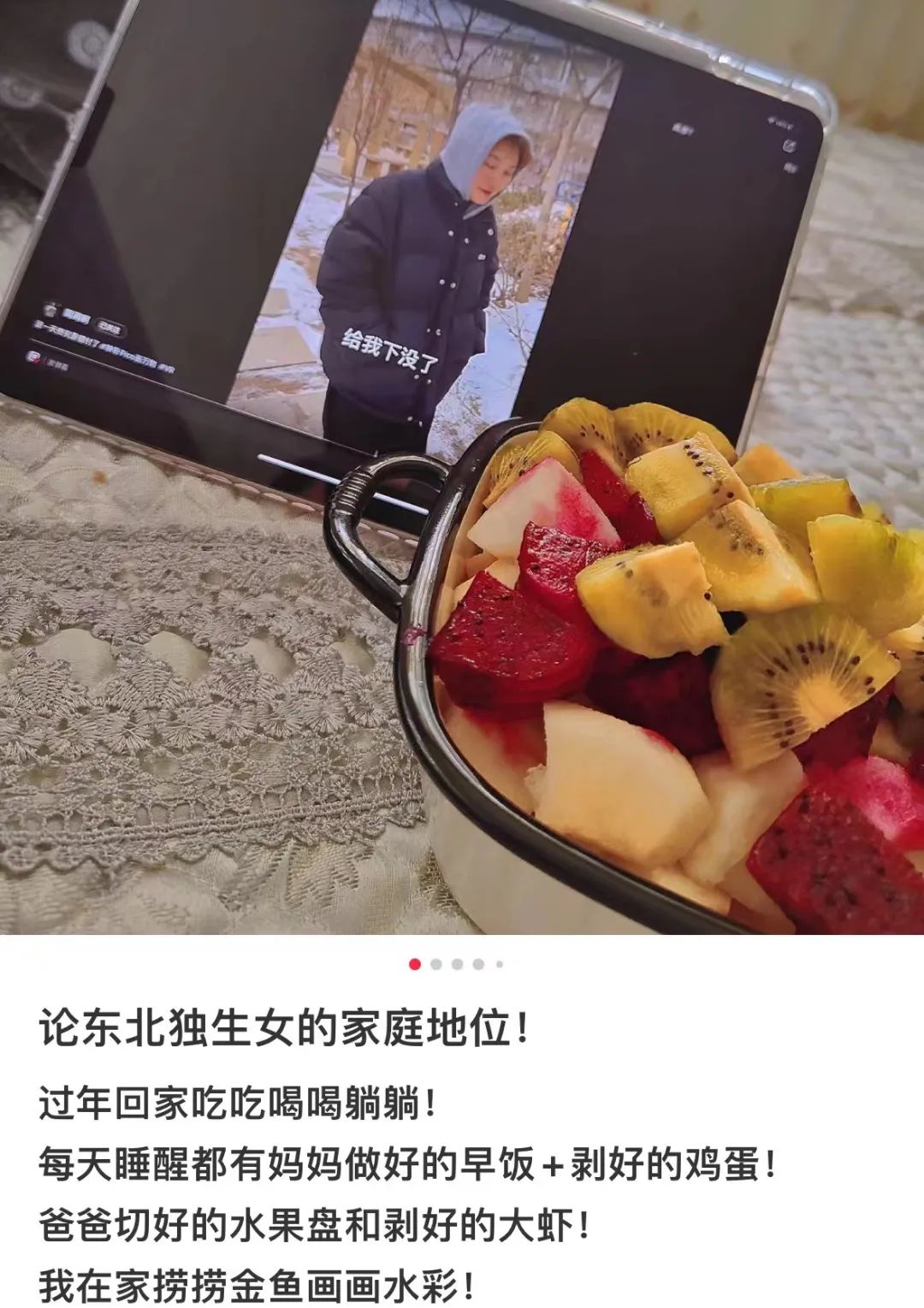 东北独生女结婚前,车房都会被父母配置好/图源:@刘百万对于在外漂泊的东北独生女来说,回家后爸妈注意的第一件事,就是孩子胖了还是瘦了。“这是他们用来评判孩子在外过得好不好,有没有亏待自己的标准。”