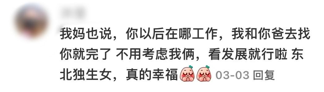 “东北父母并没有把女儿绑在身边的执念,反而女儿在哪里扎根,他们就在哪里布局。不同于富庶地区为孩子殚精竭虑,生怕掉落阶级,东北人天然对孩子没什么期待,只希望你自食其力就够了。”