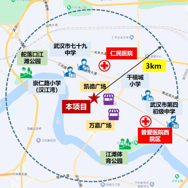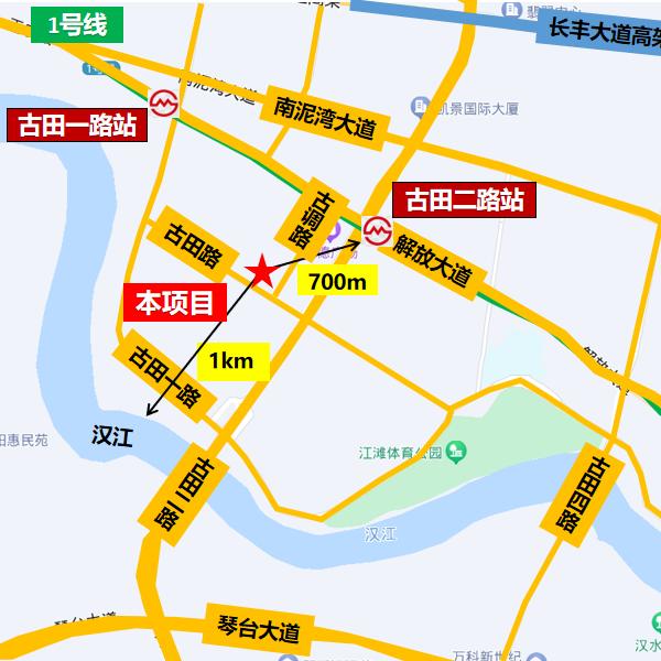 距汉江1公里、硚口区人民政府3公里、高铁站6.5公里