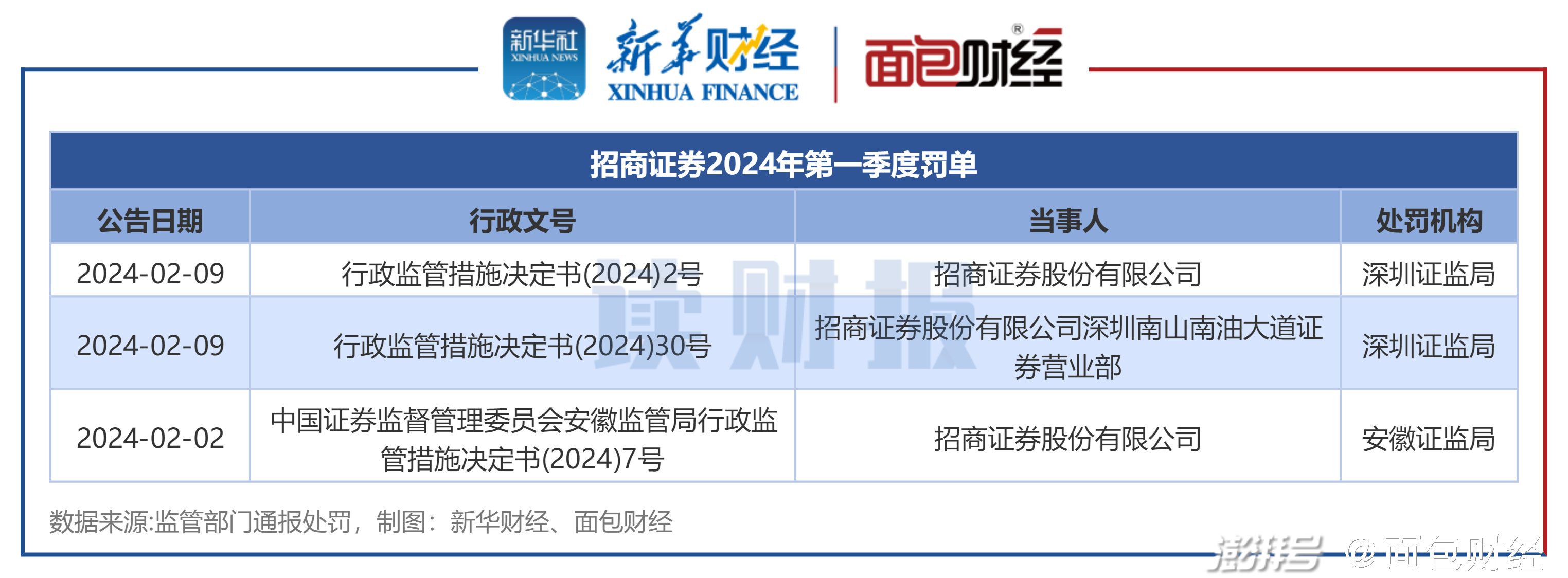 2024年第一季度,涉及招商证券及其分支机构的罚单有3张,均由证监会分局出具。