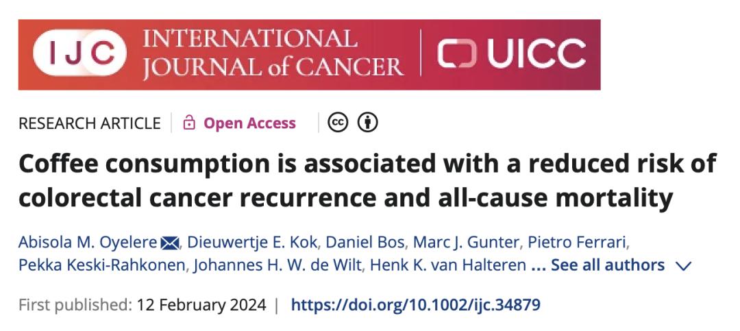 [2]Oyelere AM, Kok DE, Bos D, Gunter MJ, Ferrari P, Keski-Rahkonen P, de Wilt JHW, van Halteren HK, Kouwenhoven EA, van Duijnhoven FJB, Kampman E. Coffee consumption is associated with a reduced risk of colorectal cancer recurrence and all-cause mortality. Int J Cancer. 2024 Jun 15;154(12):2054-2063. doi: 10.1002/ijc.34879. Epub 2024 Feb 12. PMID: 38346920.