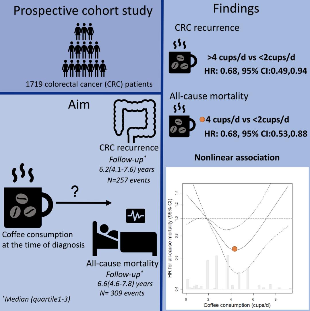 综上所述,这项前瞻性研究显示,饮用咖啡与CRC复发和全因死亡风险降低有关,其中每日3-5杯为最佳。