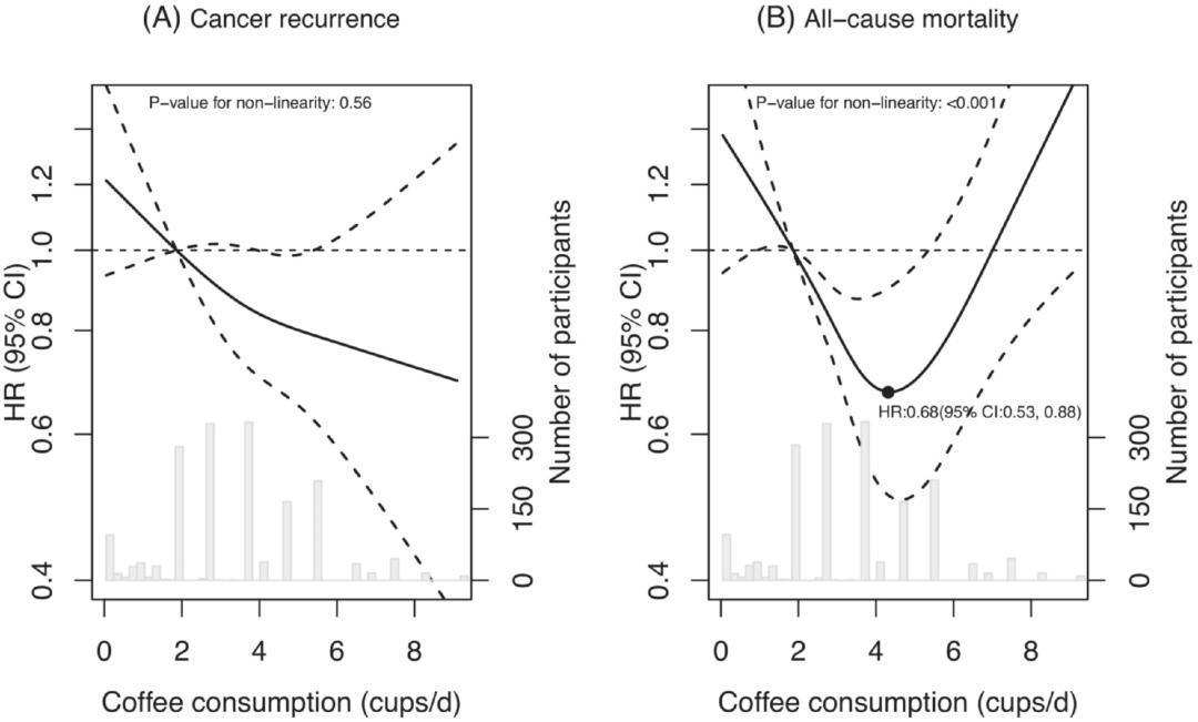 研究过程和结果多变量调整模型显示,与每天饮用咖啡<2杯的相比,>4杯/天的CRC复发风险降低了32%。事实上,咖啡饮用量与CRC复发之间存在线性关联,即饮用得越多,CRC的复发风险反而越低。