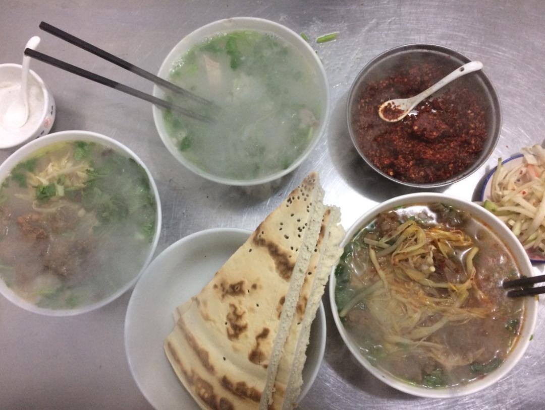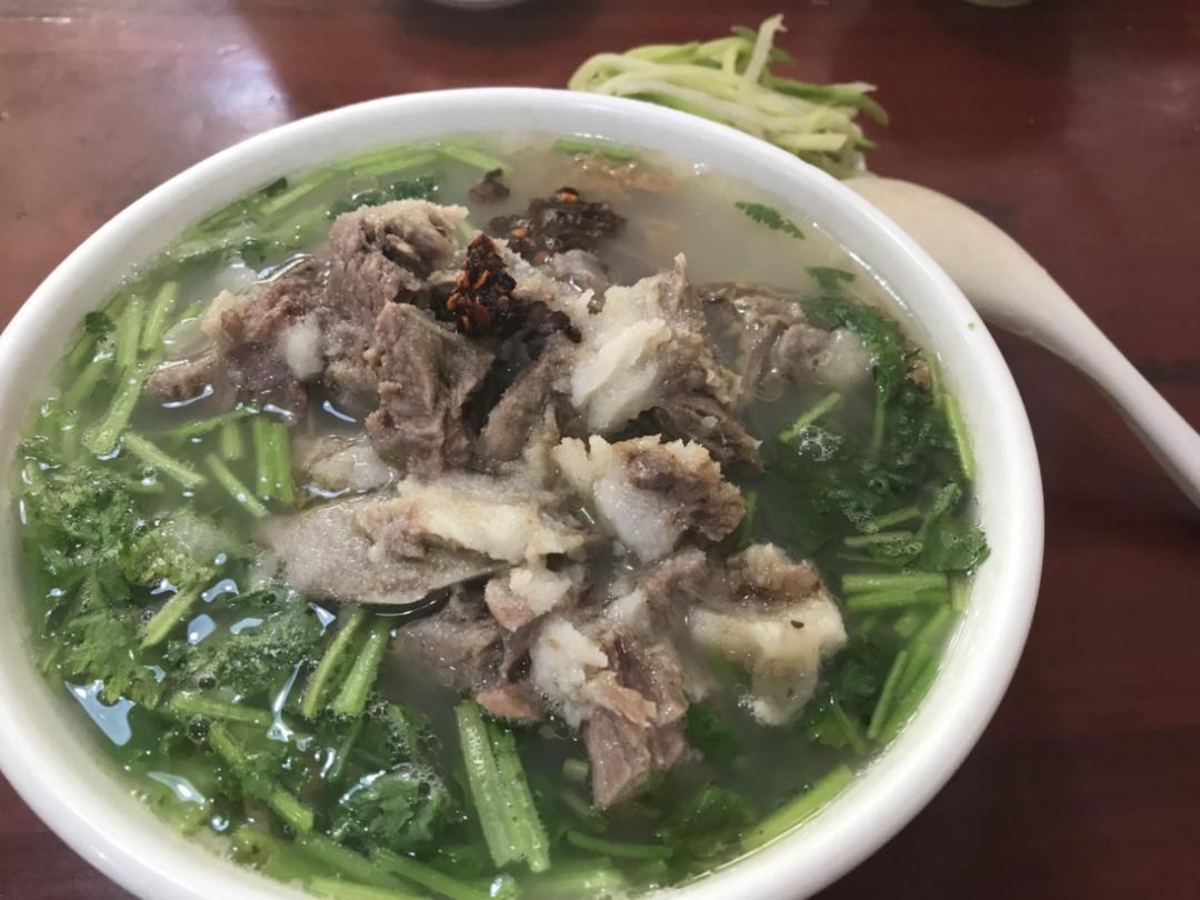 羊肉汤丨图虫创意开封还有一种传统汤“四味菜”,卖这种汤的炉灶相当壮观,四口汤锅同时翻滚着,分别炖煮着炸肉丸子、炸酥肉或是牛/羊肉块、炸面筋、黄花菜。点餐后,老板迅速在每口锅中各盛一勺,放入碗中,浇满浓汤,撒上香菜和辣椒油。四种不同滋味和口感的配菜荟萃一碗,每一口都是惊喜。