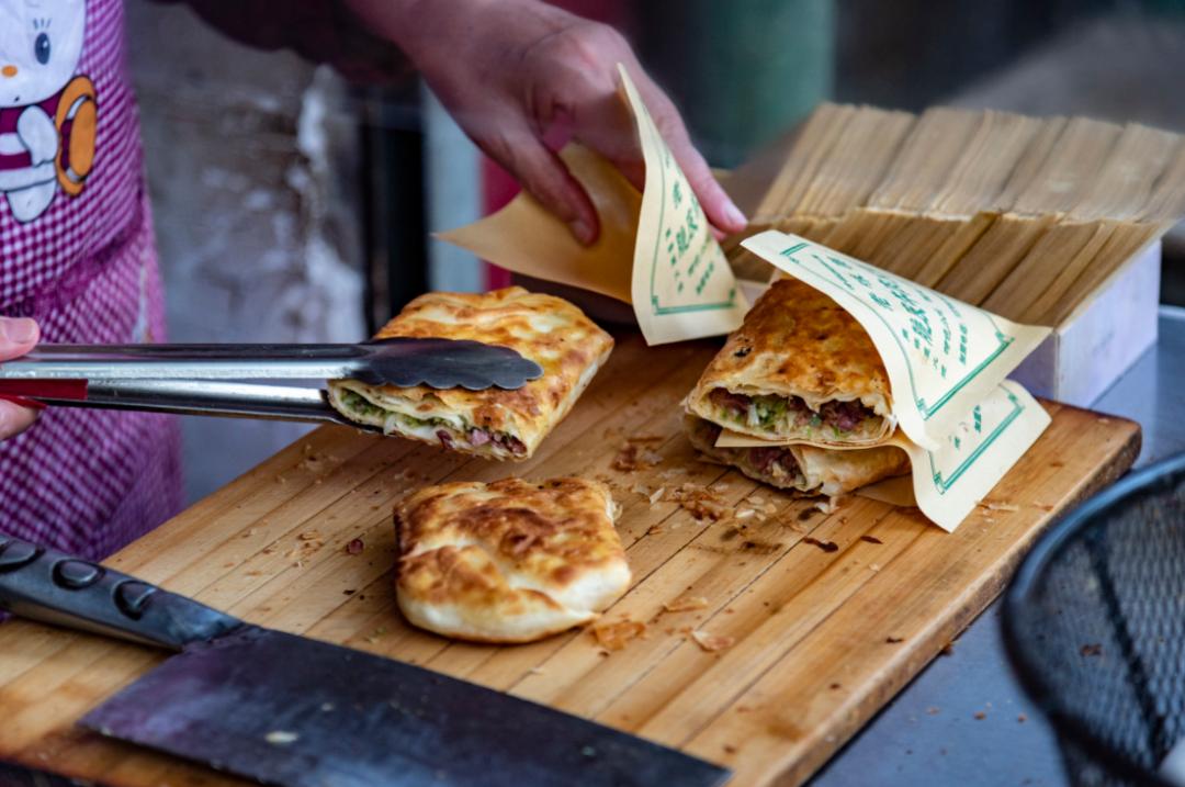 炒凉粉丨图虫创意炒凉粉的“隐藏吃法”是把刚出炉的高炉烧饼从中剖开,夹入凉粉,热乎乎地咬一大口,外焦里软,也算一种独特的“碳水组合”的快乐。学生党更喜欢烧饼夹碳烤鸡腿、烤羊肉串,扎实管饱。