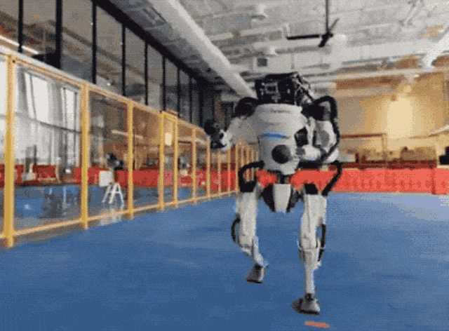 而在1分钟时,它做前空翻时落地的姿势偏低了,这直接就导致了严重的后果——它摔倒在地,液压油从它的双膝喷射而出。