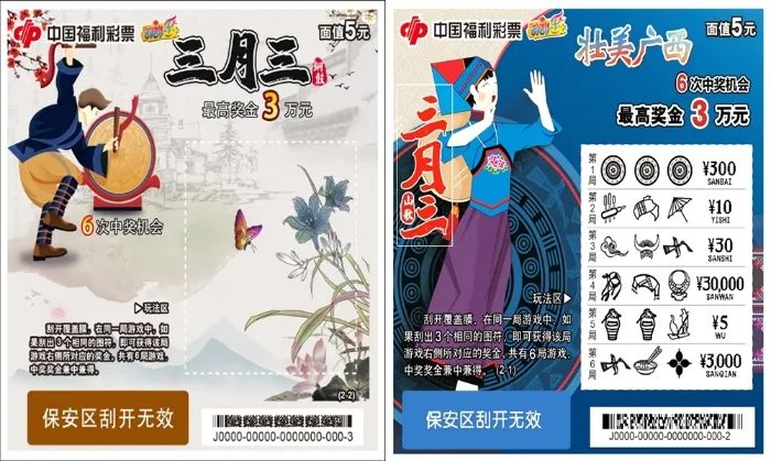 广西、山西上市的地方特色主题票“三月三”和“人说山西好风光”均采用这种简单的玩法。还有的游戏设置的是二同图符,甚至五同图符,均属一类玩法。