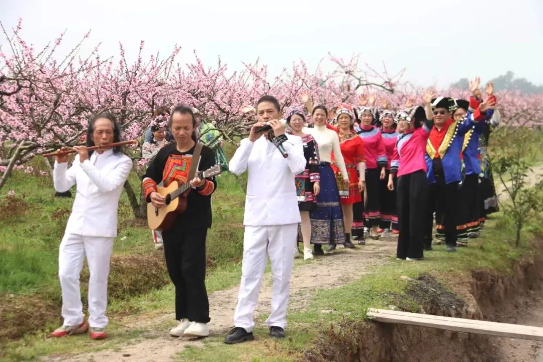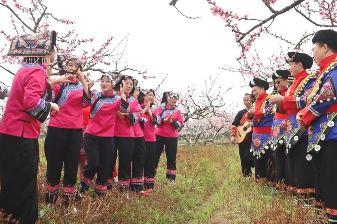 活动现场,各族群众身鲜艳服饰穿梭在桃林间。大家沿着桃树田垄相对而立,在当地文联音乐家协会老师们的乐器伴奏下,齐唱起《六口茶》。鲜艳服饰在红彤彤的桃花映衬下显得格外亮眼,引得周边不少人驻足拍摄、打卡,跟学现唱,奏响了各族群众交往交流交融的“律动曲”。