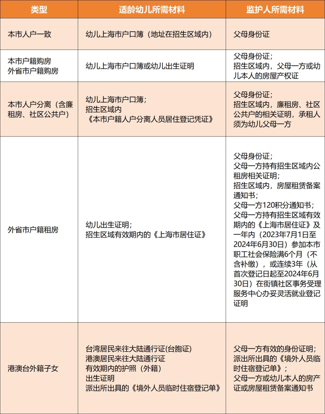 父母一方持有招生区域有效期内的《上海市居住证》《房屋租赁备案通知书》及一年内(2023年7月1日至2024年6月30日)参加本市职工社会保险满6个月(不含补缴),或连续3年(从首次登记日起至2024年6月30日)在街镇社区事务受理服务中心办妥灵活就业登记证明。