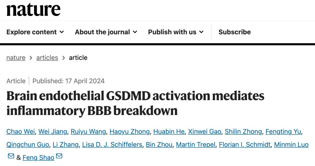 2024年4月17日,北京生命科学研究所/清华大学生物医学交叉研究院邵峰团队与北京脑科学与类脑研究所罗敏敏团队合作,在 Nature 期刊发表了题为:Brain endothelial GSDMD activation mediates inflammatory BBB breakdown 研究论文。