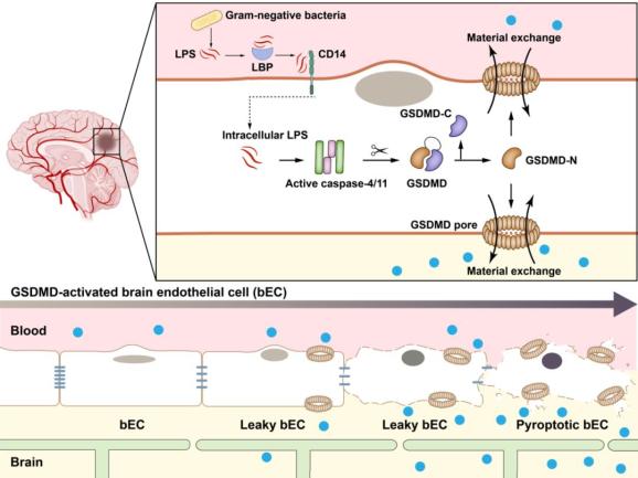 该研究阐释了血脑屏障炎症性破坏的机制——革兰氏阴性菌感染或脂多糖(LPS)刺激下,激活脑内皮细胞中的caspase-4/11-GSDMD信号通路,从而导致血脑屏障的炎症性破坏。