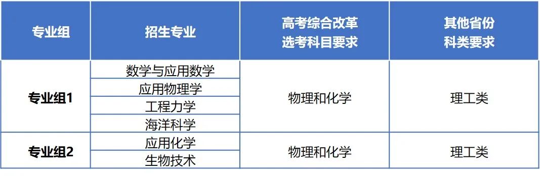 今年在原有的数学与应用数学、应用物理学、工程力学、应用化学和生物技术的基础上,新增了海洋科学专业。