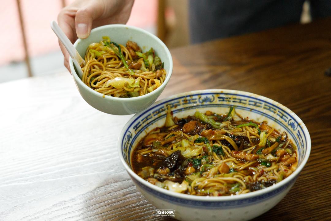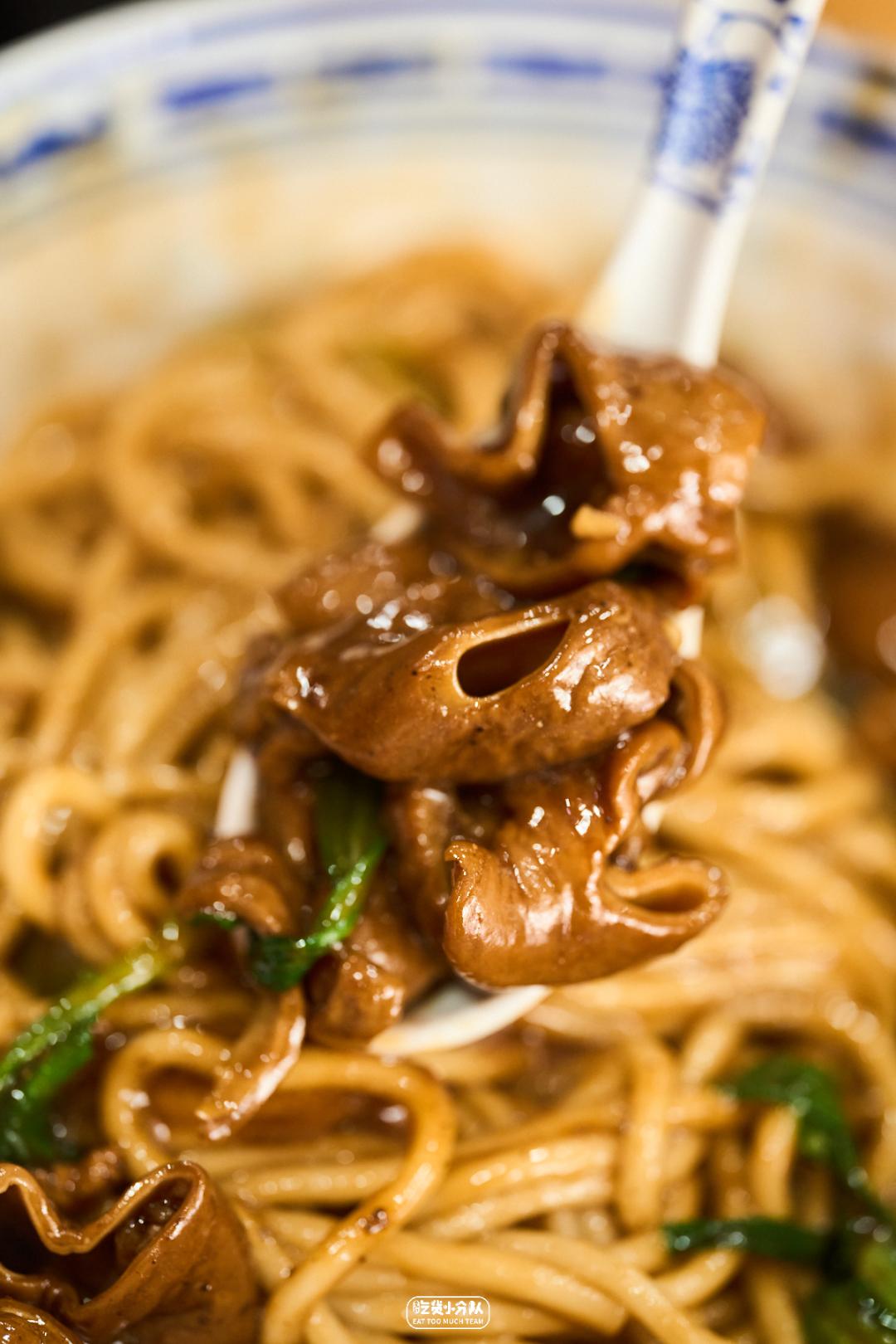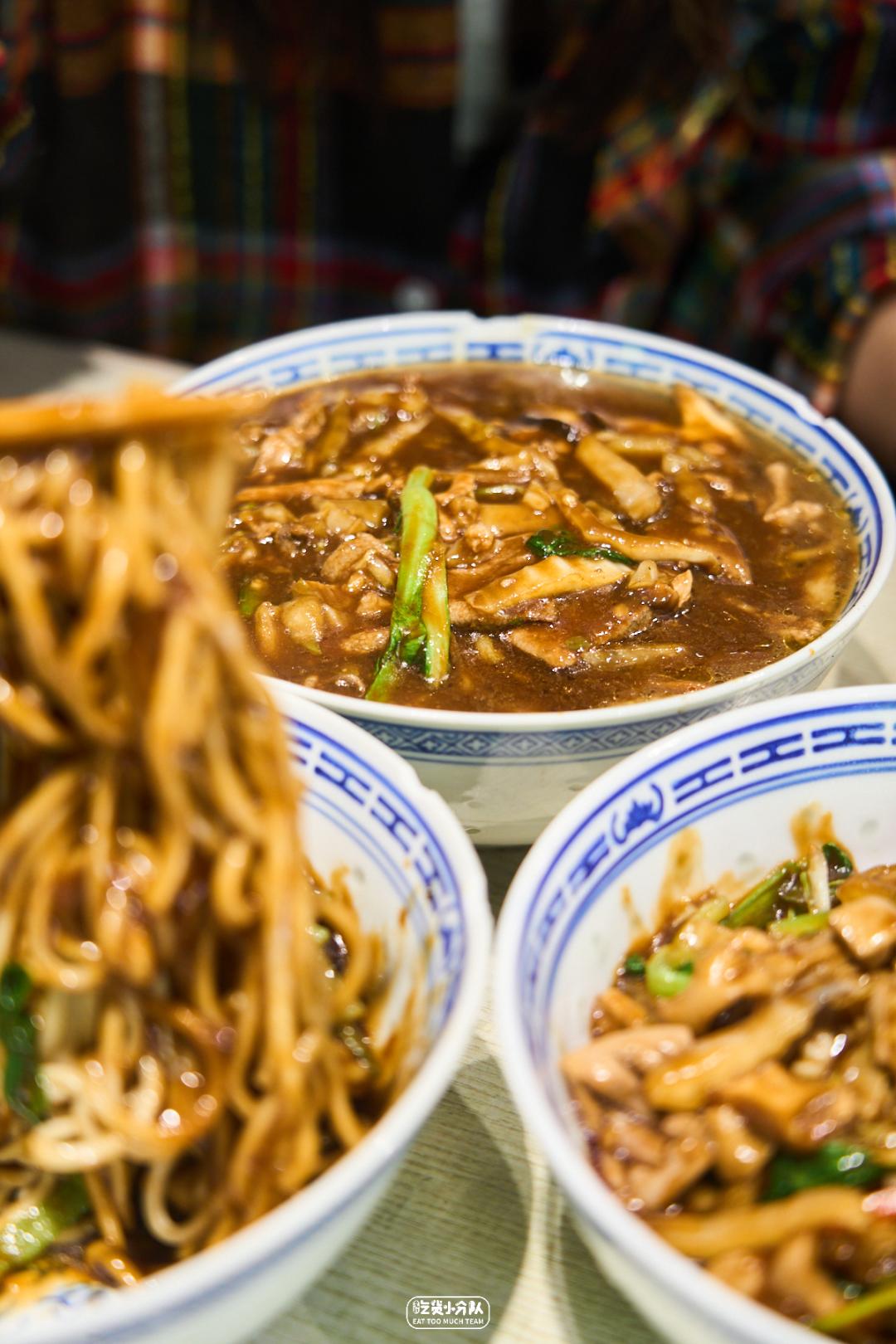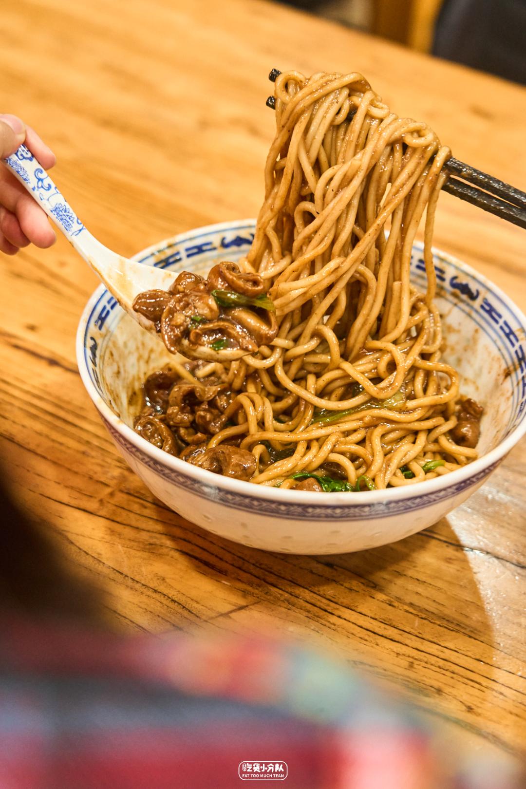 这店是卢湾区四大金刚面馆的延续,24h营业,从不打烊。掌厨的是卢湾传奇面条师傅缩头的传人。传承老派卢湾面馆的风格,每日现炒的浇头、浓油赤酱。开在一众上海老字号老大昌、老人和、沧浪亭之中,自有一番底气。各种内脏的处理不在话下,姚明都去过几次。(听说姚老板独爱9号桌。)份量max版 · 辣肉素交面 ·