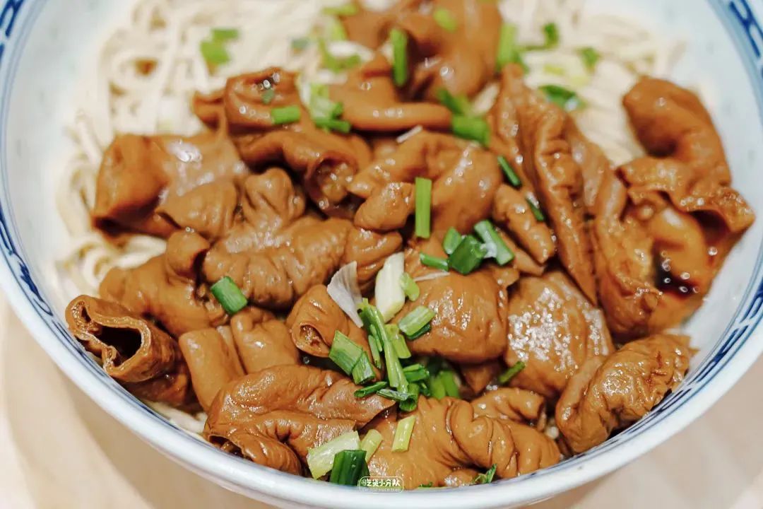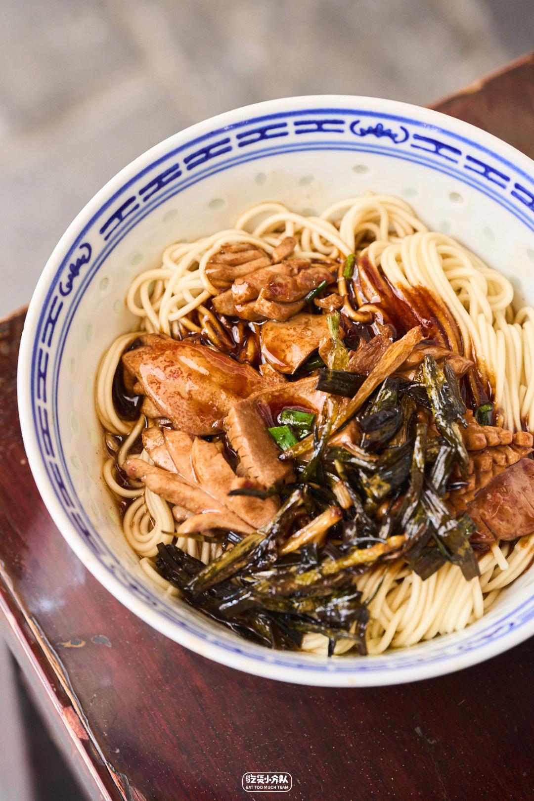 大肠面当然是桌桌必点,还有些懂经爷叔会在点单时讲出神秘密语:“来1碗大辣烤拌!”,也就是大肠面配辣肉、配烤麸...妥妥一份全家福。单尝一口大肠浇头,红烧的圈子酱香味浓,是上海宁欢喜的偏甜口感。软糯又有嚼劲,分量也是实打实的足,咪道哈赞。「大肠面」