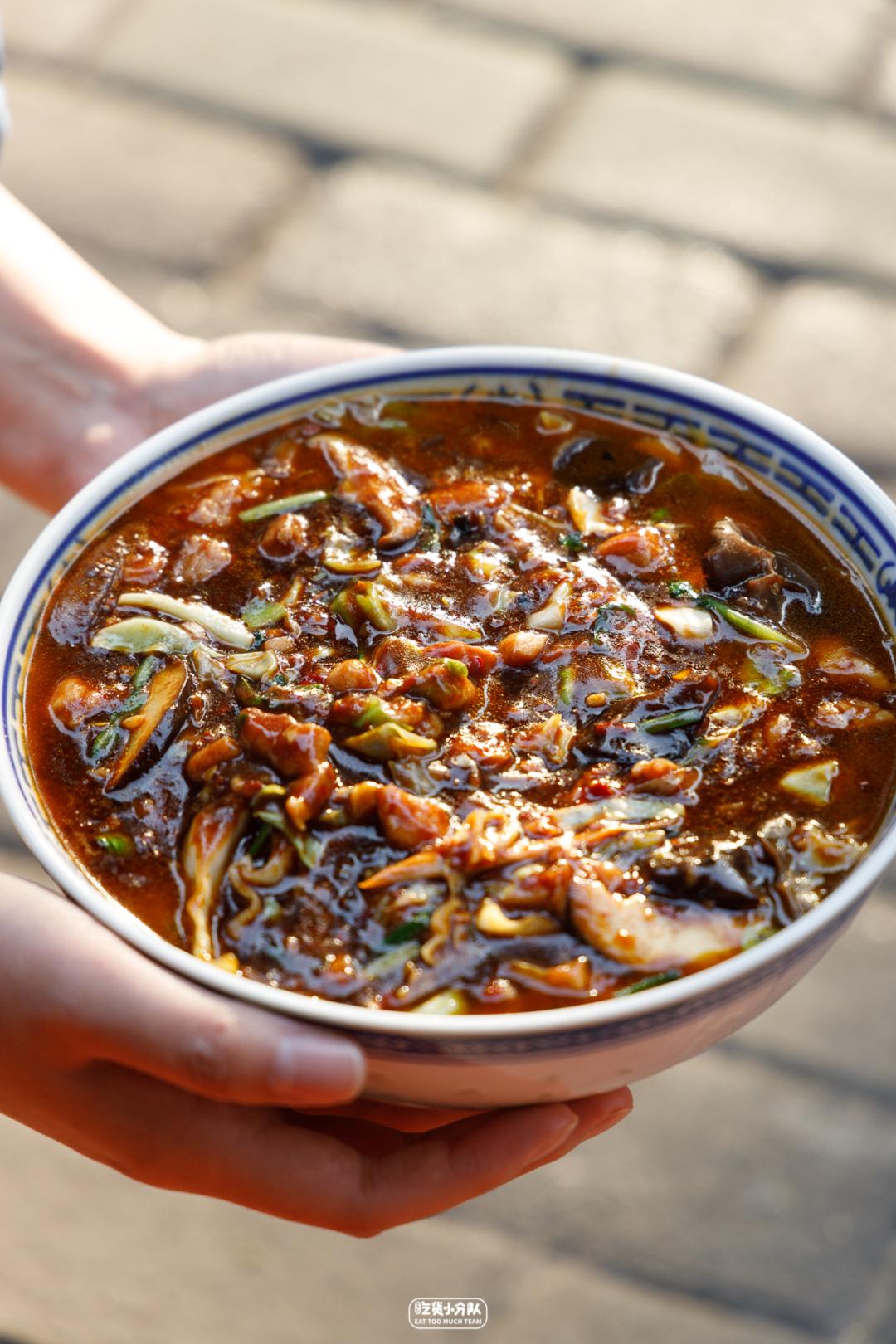 一碗辣肉素交面,浇头盖得严严实实,满满的瘦肉丁,配上浓厚的酱汁,鲜甜爽辣,把面撩起都能感受到阻力。合作面厂专送的鸡汁面,不同于“缩头”派的粗面,虽然细但也很有嚼劲儿,劲道利落。分量很足,一大碗能装满很多个小碗。「小管面馆」