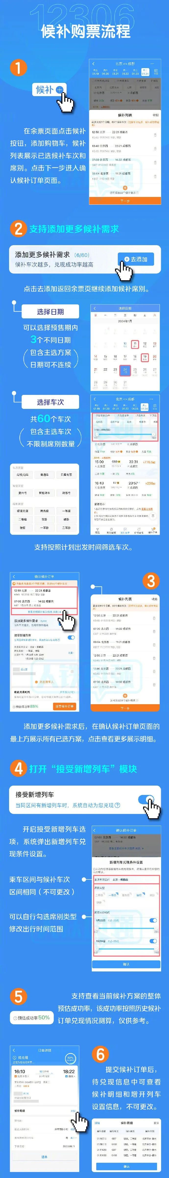 ③候补购票:每个用户可以有6个待兑现候补订单,每个候补订单最多可选择3个乘车日期,总计添加不超过60个车次,最多可添加9位乘车人,最晚候补订单截止兑现时间为不晚于开车前20分钟。